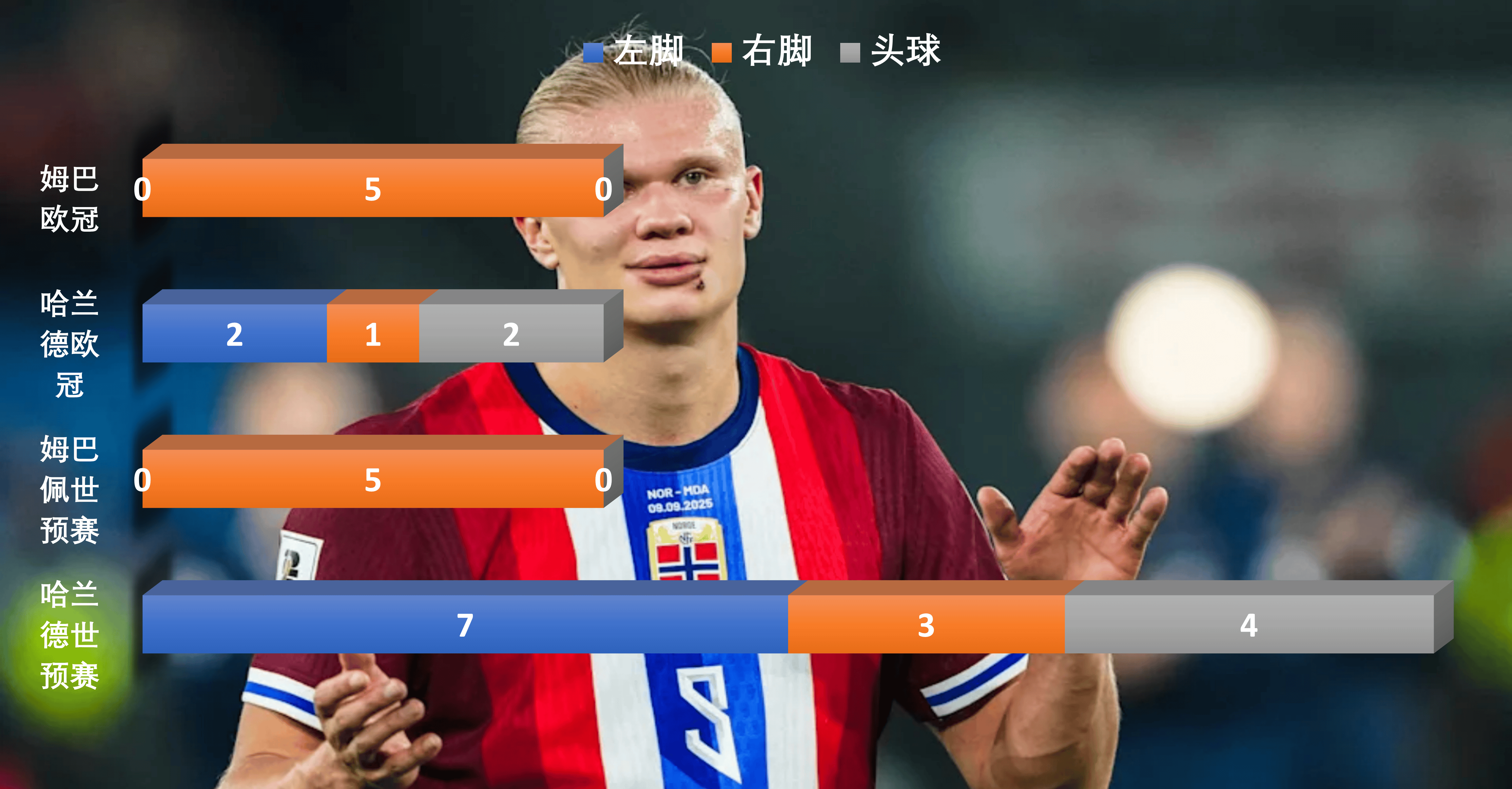 ในทางกลับกัน เอ็มบัปเป้พึ่งพาเท้าขวาที่โดดเด่นของเขาอย่างมาก; ทั้งสิบประตูของเขาในฤดูกาลนี้ ทั้งในรอบคัดเลือกฟุตบอลโลกและแชมเปียนส์ลีก ล้วนทำด้วยเท้าขวาทั้งสิ้น
