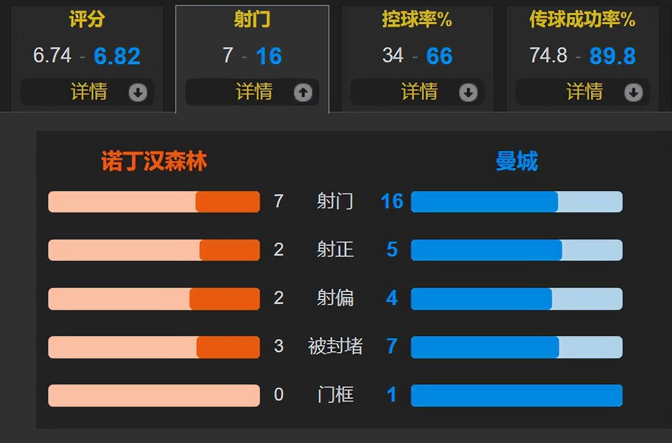 ตลอดการแข่งขันแมนเชสเตอร์ ซิตี้ครองบอล 66% ยิงทั้งหมด 16 ครั้ง โดยเข้ากรอบ 5 ครั้ง; น็อตติงแฮม ฟอเรสต์ ยิงทั้งหมด 7 ครั้ง โดยเข้ากรอบ 2 ครั้ง