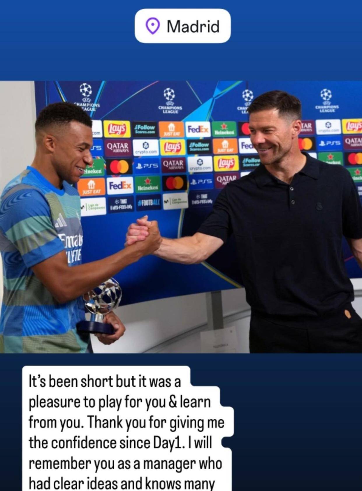 ตื่นขึ้นมาพบว่าเรอัล มาดริดได้ปลดผู้จัดการทีมอีกครั้ง! เอ็มบัปเป้ส่งความปรารถนาดีถึงอลอนโซ: "เป็นเกียรติอย่างยิ่งที่ได้เล่นภายใต้การคุมทีมของคุณ" _นักเตะ_ _ห้องแต่งตัว_ _ยูฟ่า แชมเปียนส์ลีก_