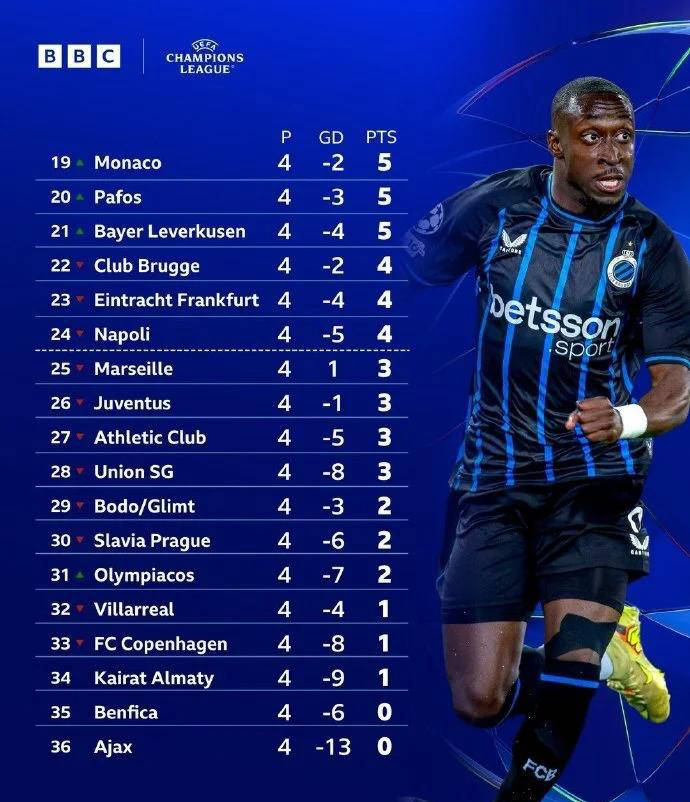 เมื่อวันที่ 6 พฤศจิกายน เวลาปักกิ่ง การแข่งขันทั้งหมดของแมตช์เดย์ที่ 4 ในรอบแบ่งกลุ่มของยูฟ่าแชมเปียนส์ลีก ฤดูกาล 2025-26 ได้สิ้นสุดลงแล้ว หลังจากการแข่งขันรอบนี้ อันดับตารางคะแนนได้เปลี่ยนแปลงไปอย่างมากอีกครั้ง ปัจจุบัน มีเพียงสามทีมเท่านั้นที่ยังไม่แพ้ใครและมีสถิติสมบูรณ์แบบ ได้แก่ อินเตอร์ มิลาน, บาเยิร์น มิวนิค และอาร์เซนอล