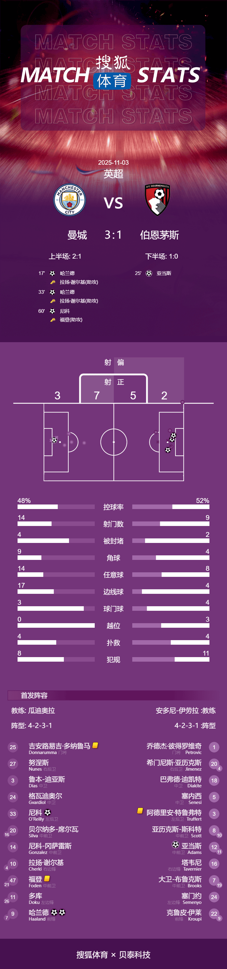 เวลา 00:30 น. ของวันที่ 3 พฤศจิกายน 2025 การแข่งขันพรีเมียร์ลีกนัดที่ 10 ของฤดูกาลมีการพบกันที่น่าจับตามองเมื่อแมนเชสเตอร์ซิตี้เปิดบ้านต้อนรับการมาเยือนของบอร์นมัธที่สนามเอติฮัด ในครึ่งแรก เซร์กี้ทำแอสซิสต์ให้ฮาแลนด์ยิงจ่อๆ เข้าไป บอร์นมัธตีเสมอได้จากลูกเตะมุมของอดัมส์เซร์กี้ทำแอสซิสต์อีกครั้ง ช่วยให้ฮาแลนด์สามารถเลี้ยงบอลผ่านผู้รักษาประตูและทำประตูได้ ในครึ่งหลัง โฟเดนส่งแอสซิสต์ให้โอไรลีย์ยิงประตูปิดท้ายด้วยลูกยิงต่ำ สุดท้าย แมนเชสเตอร์ ซิตี้ เอาชนะบอร์นมัธในบ้านไปได้ 3-1 ทำให้พวกเขาชนะติดต่อกันเป็นนัดที่สอง และไต่ขึ้นสู่อันดับสองในตารางพรีเมียร์ลีก ตามหลังจ่าฝูงอาร์เซนอลอยู่ 6 คะแนน