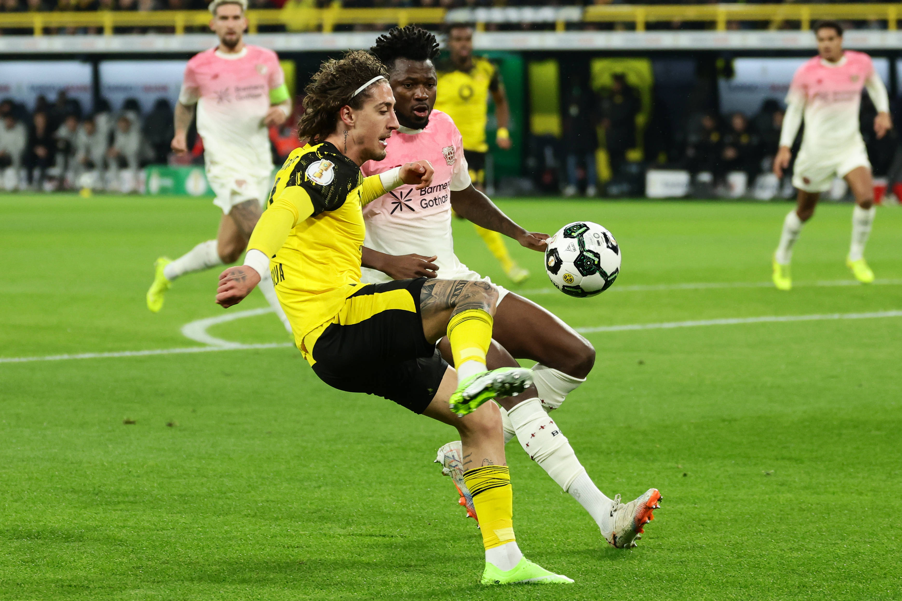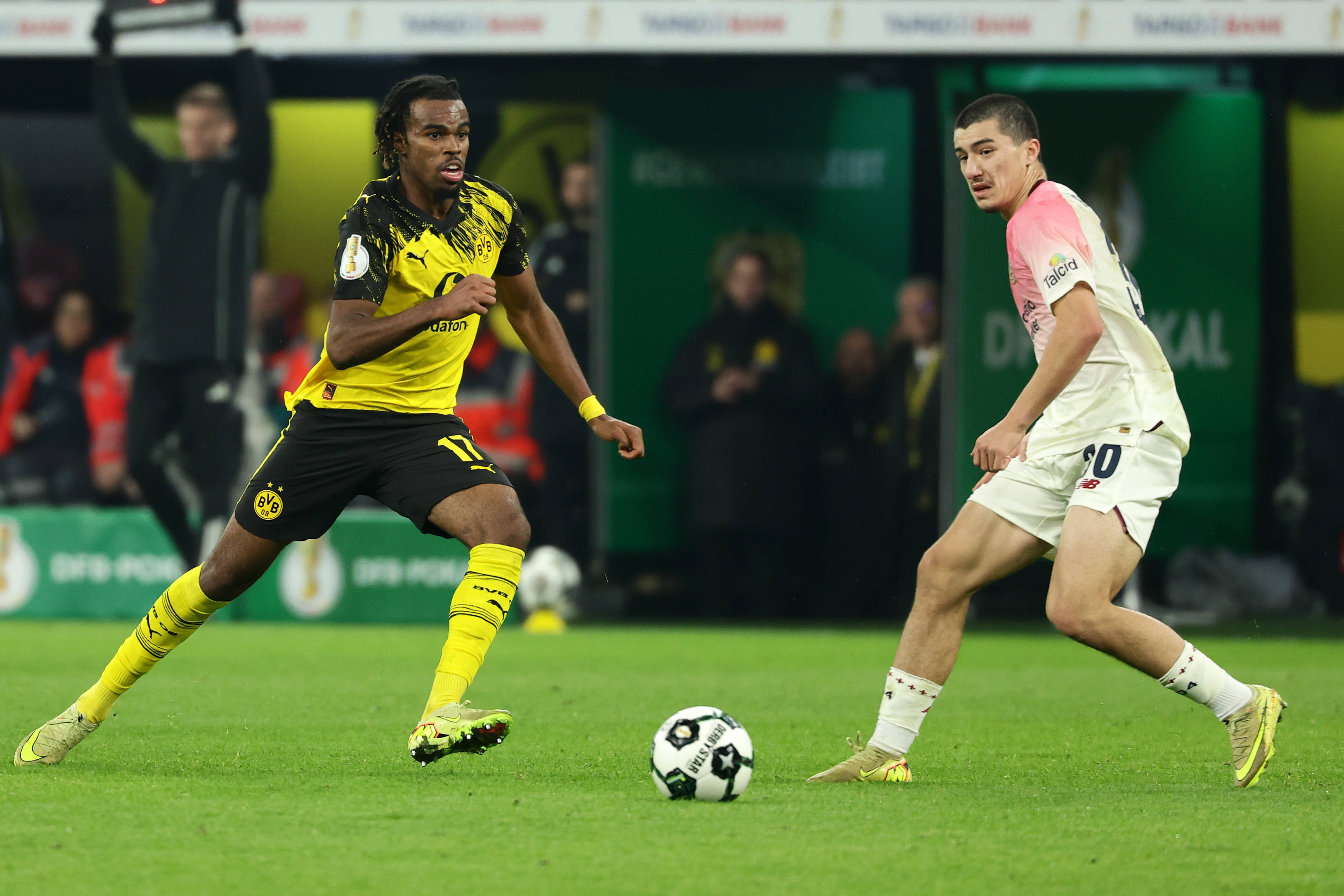 เมื่อวันที่ 2 ธันวาคม เอ็มเร่ ชาน ของโบรุสเซีย ดอร์ทมุนด์ (ซ้าย) เข้าปะทะกับ พุกกี้ ของไบเออร์ เลเวอร์คูเซ่น (กลาง) ระหว่างการแข่งขัน สำนักข่าวซินหัว (ภาพโดย Joachim Bivallés)