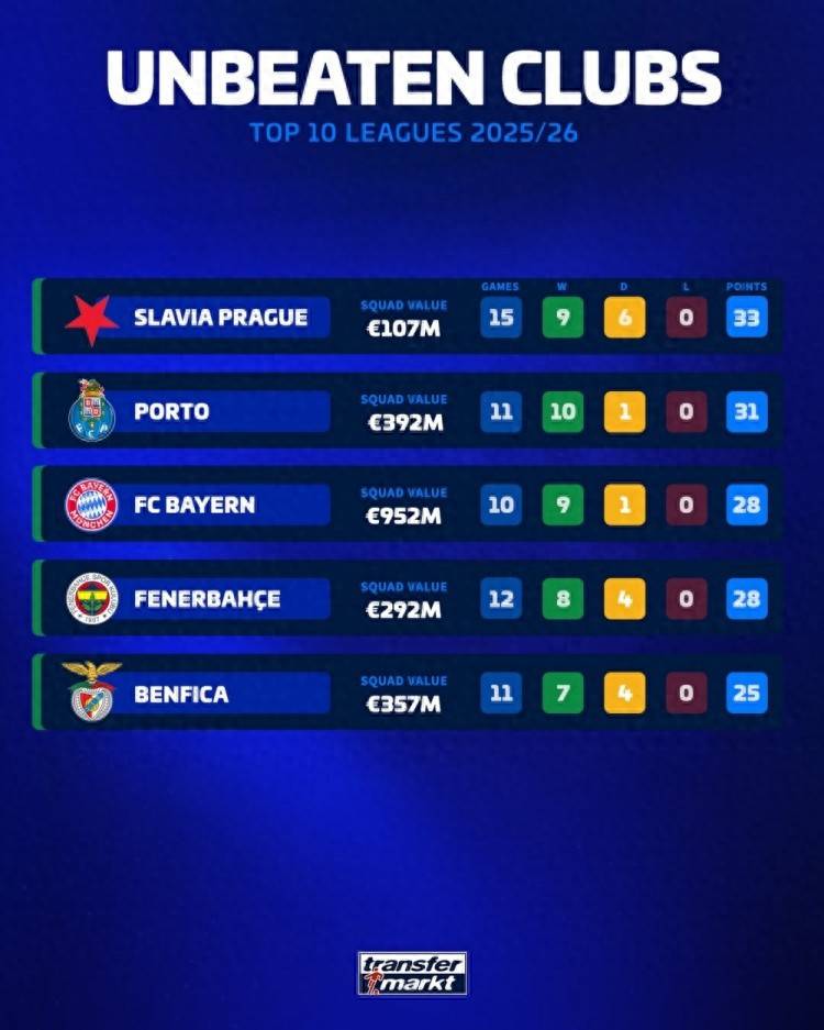 เหลือเพียงห้าทีมเท่านั้นที่ยังไม่แพ้ใครในลีกชั้นนำสิบอันดับแรกของยุโรปฤดูกาลนี้: สองทีมจากลีกสูงสุดโปรตุเกส, หนึ่งทีมจากบุนเดสลีกาเยอรมัน, หนึ่งทีมจากซูเปอร์ลีกตุรกี. คะแนน: เสมอ: อันดับ: แชมเปียนส์ลีก2025-11-11
